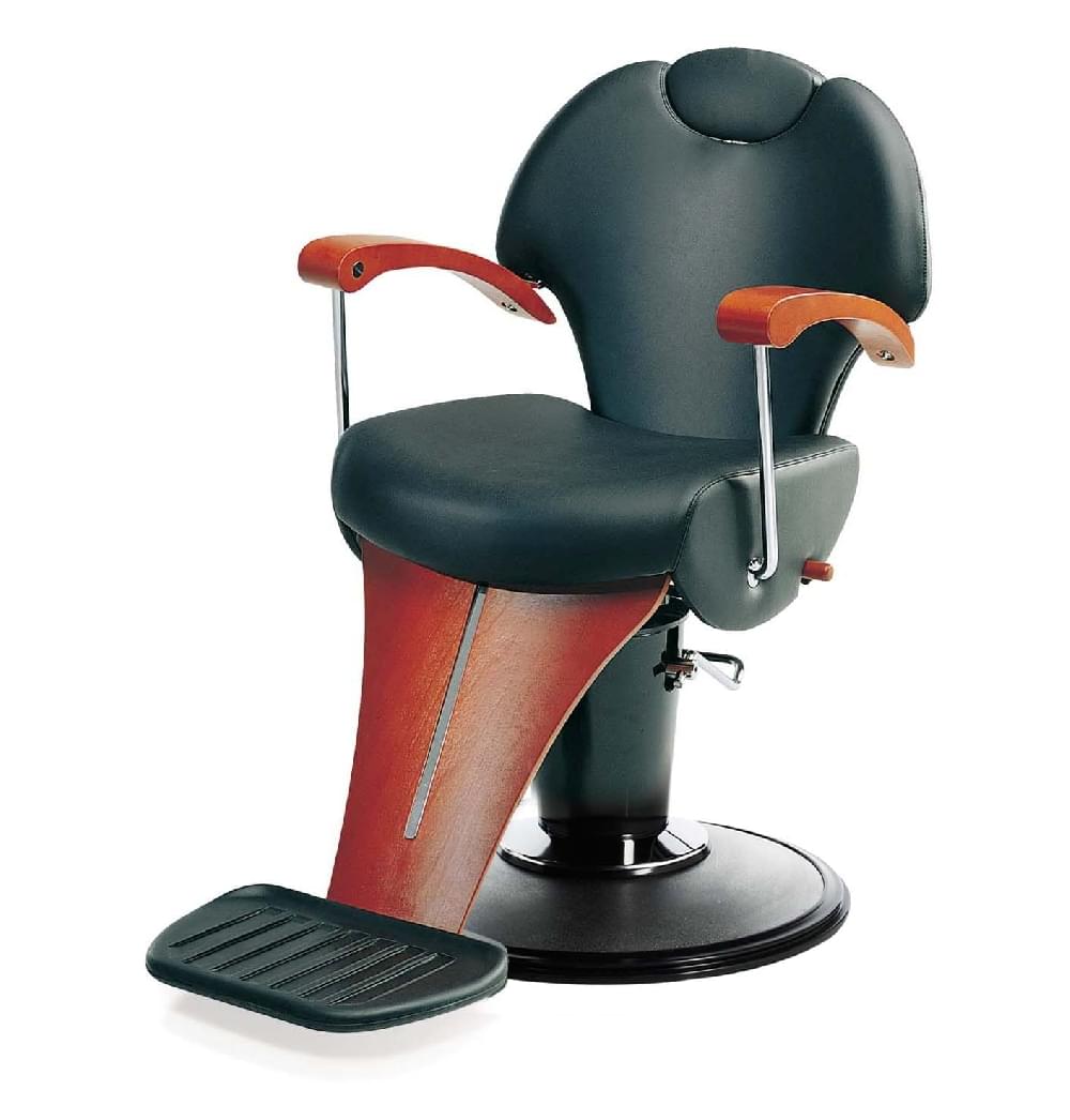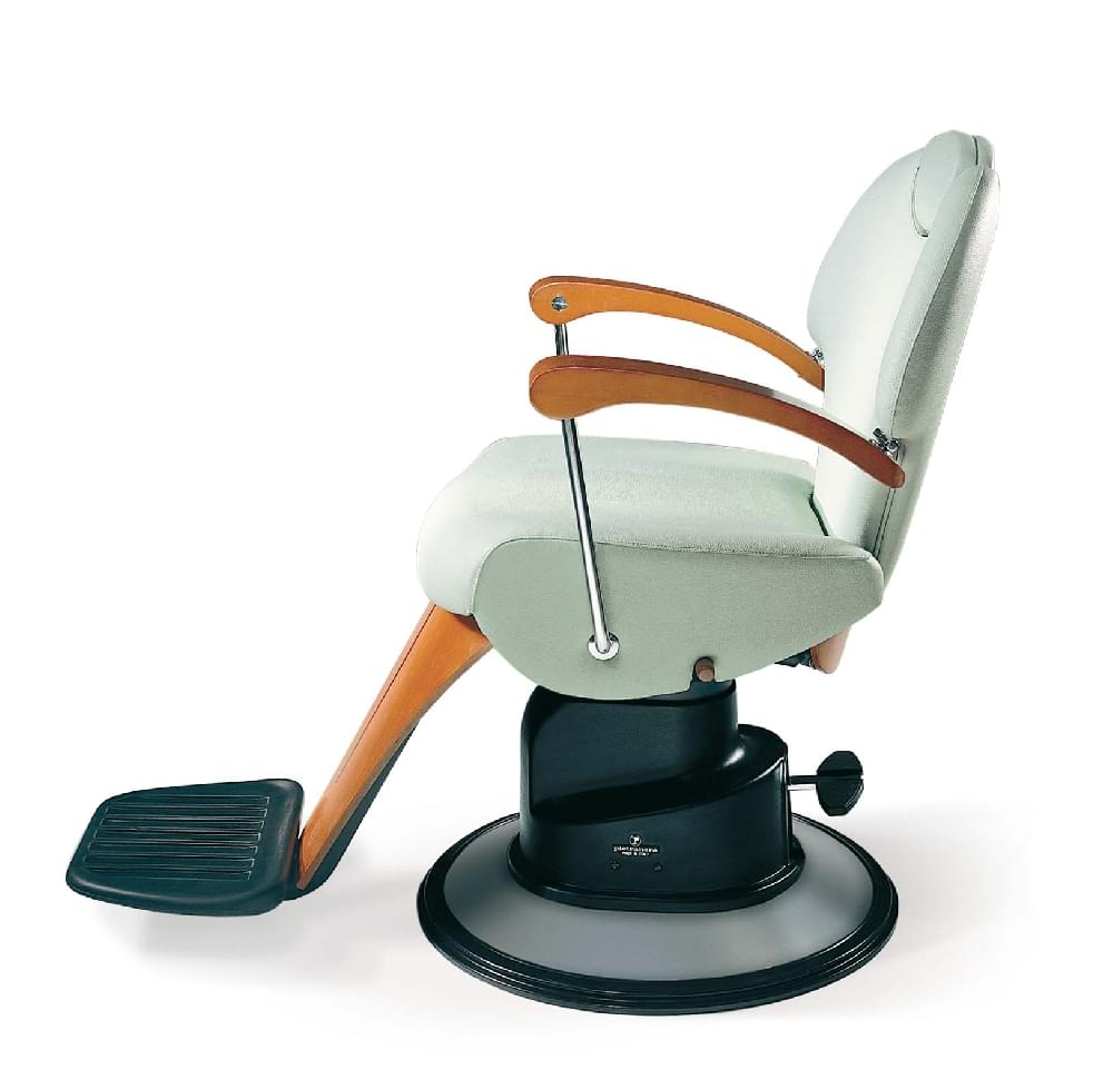 Кресло для клиента – мужское, выполнено из высококачественного поролона, каркас обтянут искусственной кожей, с выдвижным подголовником и откидной спинкой. Подлокотники выполнены из дерева, подставка под ноги деревянная с пластиковой вставкой. Комплектуется гидроподъемником с фиксацией поворота, дисковая основа.