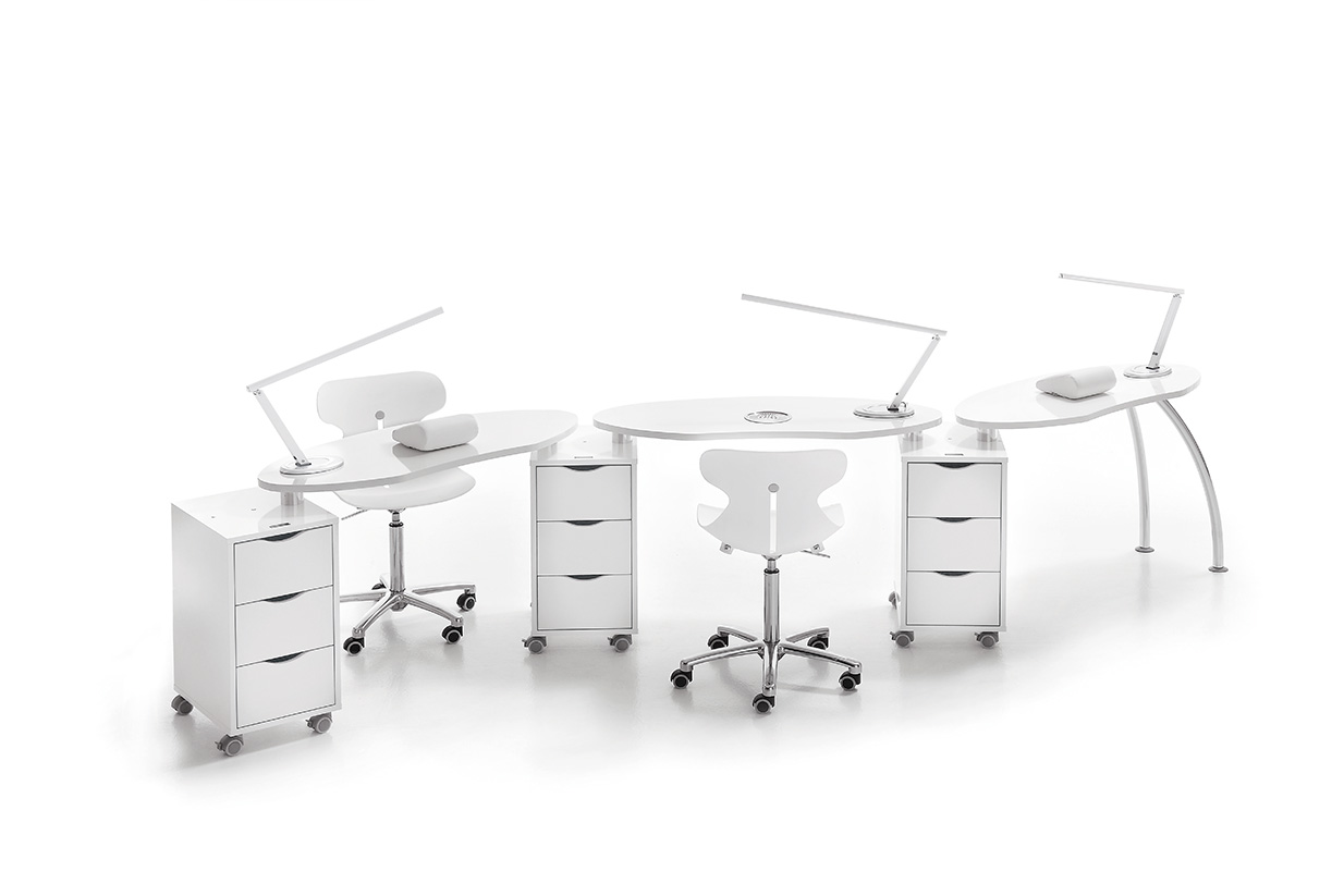 Дополнительная комплектация включает в себя светодиодную лампу с широкими возможностями регулировки, вытяжку, подушку под кисть, стул. Столешница имеет продолговатую форму, позволяющую разместить на ней все необходимые во время работы средства и инструменты.