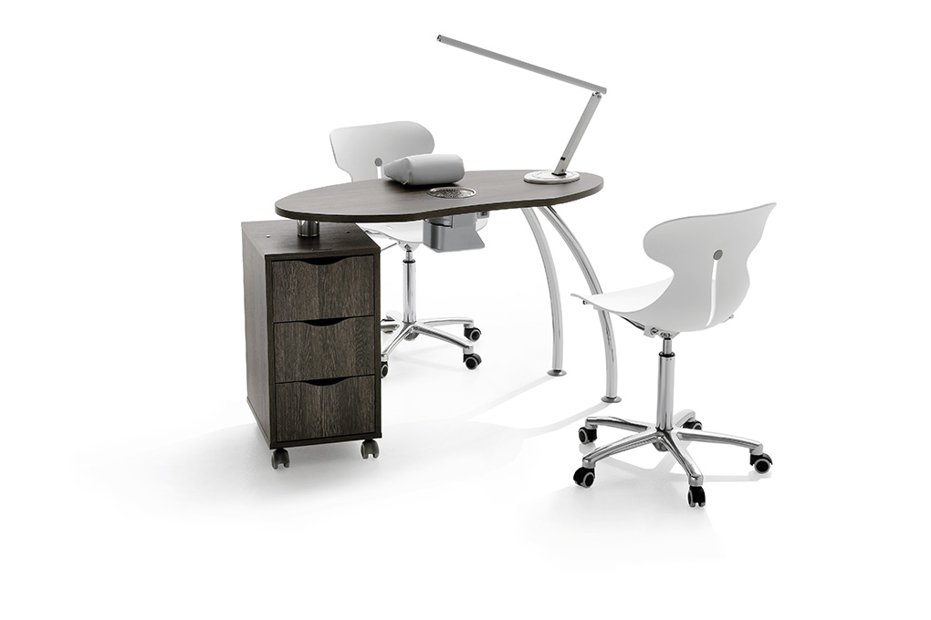 Маникюрный стол «Nail brio easy» – это универсальная модель, которая позволяет создать грамотно организованное пространство со всем необходимым для работы. Стол комплектуется комодом на колесиках, с другой стороны столешница опирается на ножки из хромированной стали с антискользящими насадками. Каркас и столешница выполняются из натурального дерева.