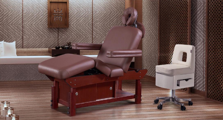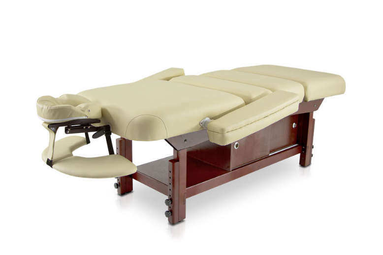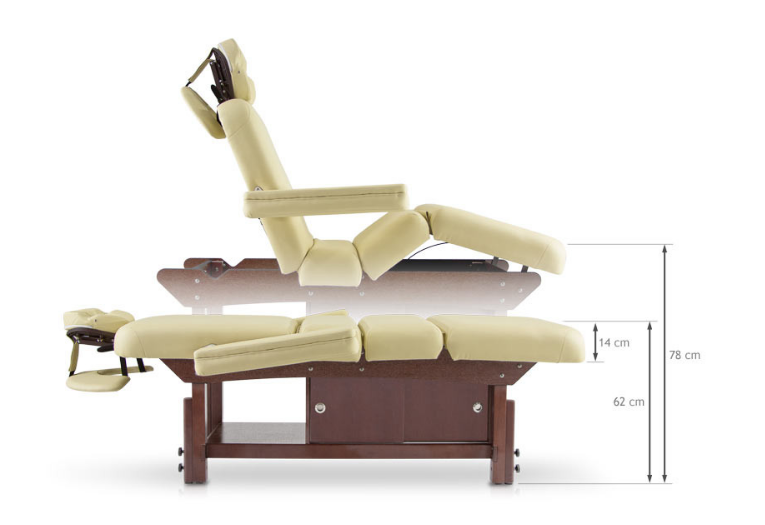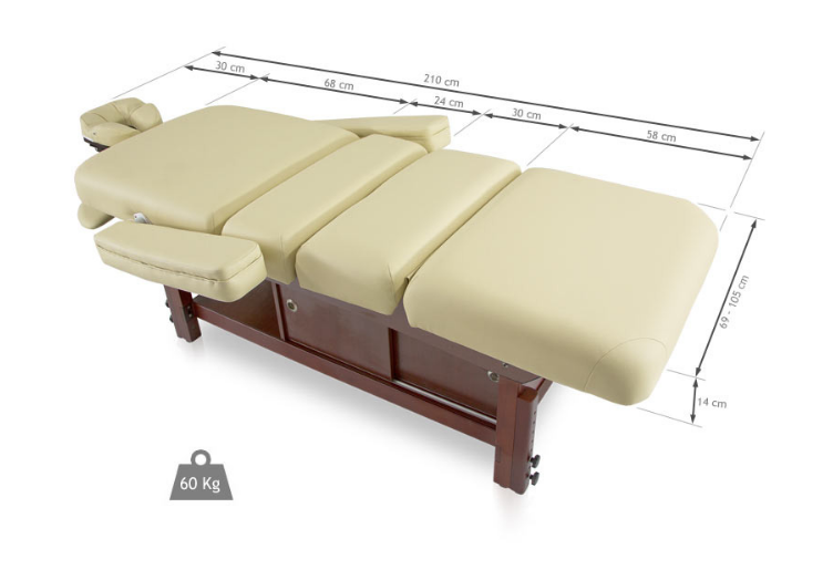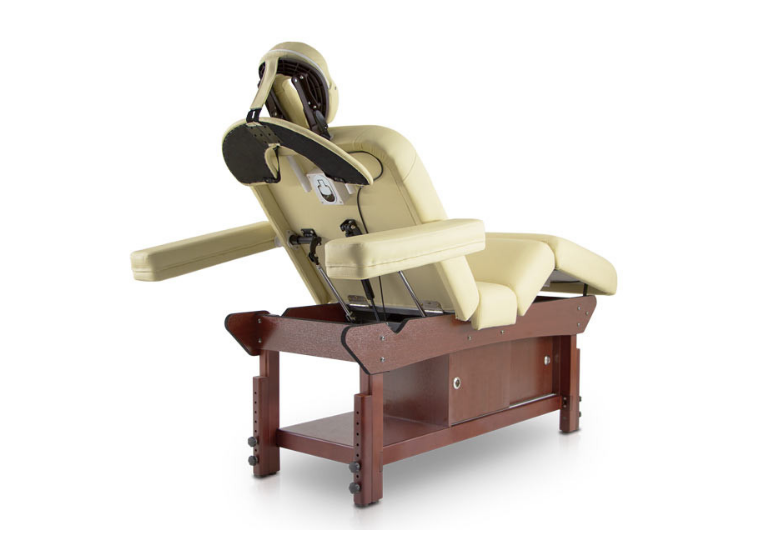 Массажная кушетка "HM-015" - имеет 4 секции, спинку с регулируемым наклоном, центральную складку, съемные подлокотники и нижняя полка с раздвижными дверями в обе стороны. Откидывающийся подголовник.