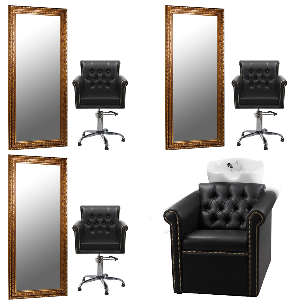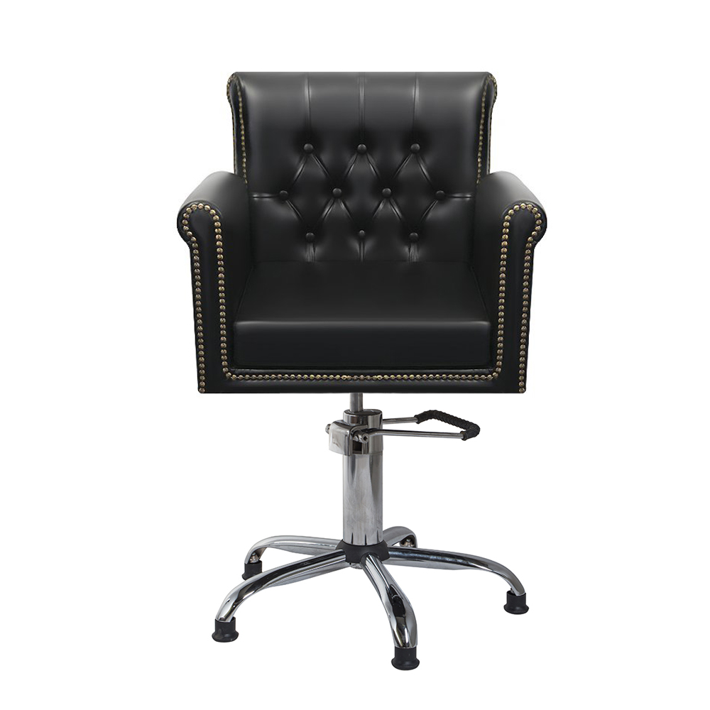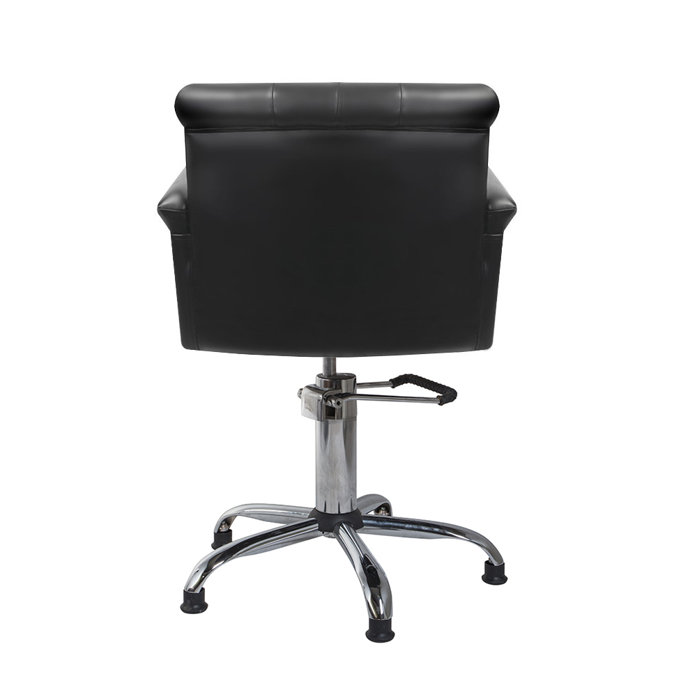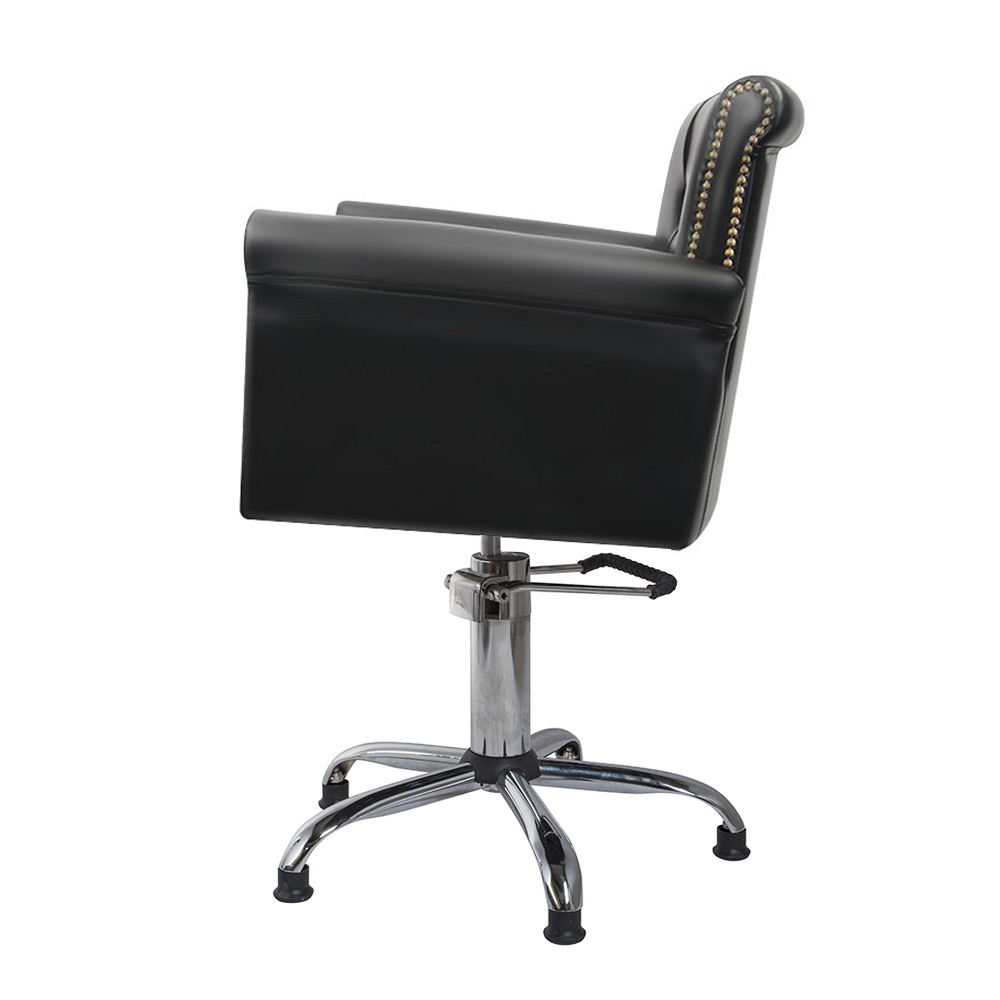 Черный цвет будет хорошо смотреться в любом помещении, широкая спинка и сидение подарят комфорт клиентам, а мастера смогут регулировать высоту с помощью гидравлического механизма. Одна из особенностей – каретная стяжка во внутренней части спинки. А пятилучье в основании делает кресло устойчивым.