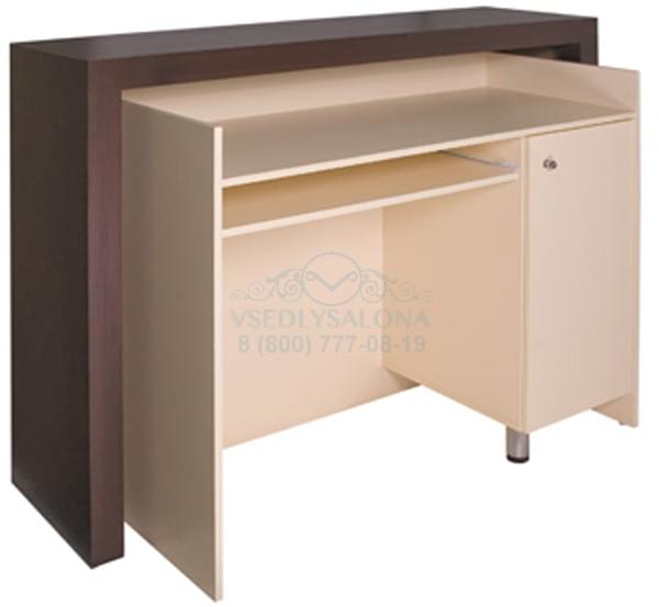 Ресепция выполнена из ламинированного ДСП, материал фасада пластик белого цвета с подсветкой. Оснащена тумбой и выдвижной полкой под клавиатуру. Цвет: венге с бежевым. Размер: (ДхШхВ) 140х72х105